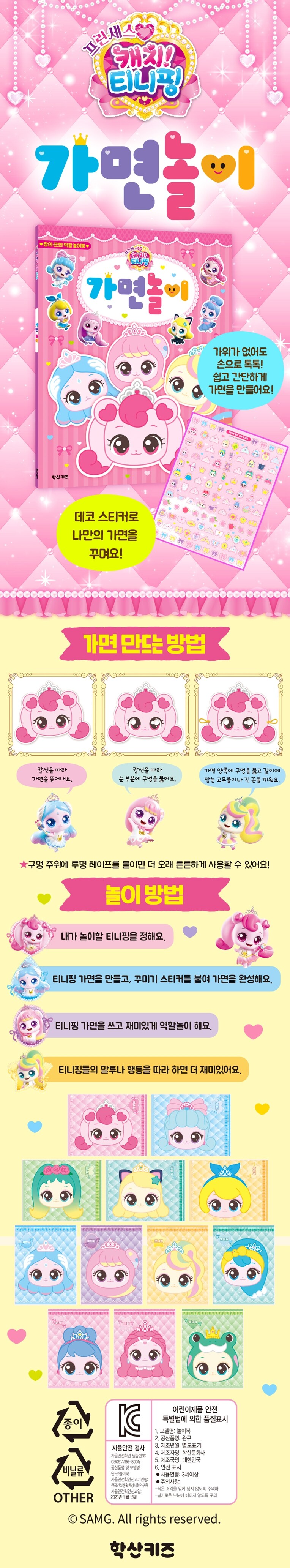 칼선을 따라 톡톡 뜯고 데코 스티커로 꾸미면 나만의 프린세스핑 가면이 완성된다. 가위 없이 안전하게 만들며 창의력과 표현력을 키우고, 티니핑 역할 놀이로 집중력과 상상력이 쑥쑥 자라는 변신 놀이북이다.