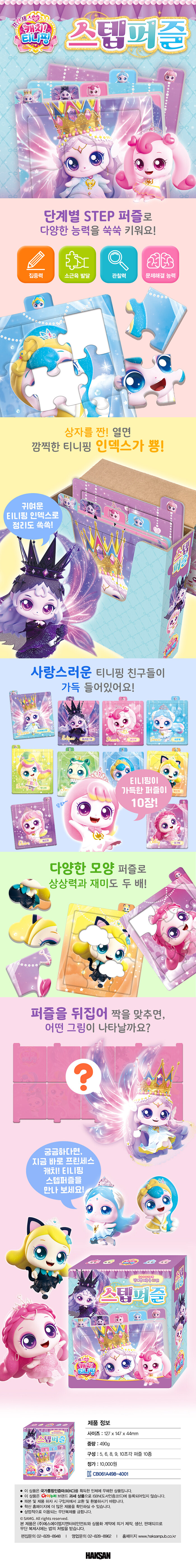 5, 6, 8, 9, 10조각의 단계별 퍼즐이 총 10장 들어있다. 쉬운 난이도의 퍼즐부터 어려운 퍼즐까지 다양한 모양의 퍼즐들을 차례대로 맞추다 보면 아이의 성취감이 쑥쑥 향상된다. 퍼즐을 다 맞췄다면, 퍼즐판에 있는 티니핑들의 설명을 읽어보고, 퍼즐 뒷면의 그림도 맞춰보자.