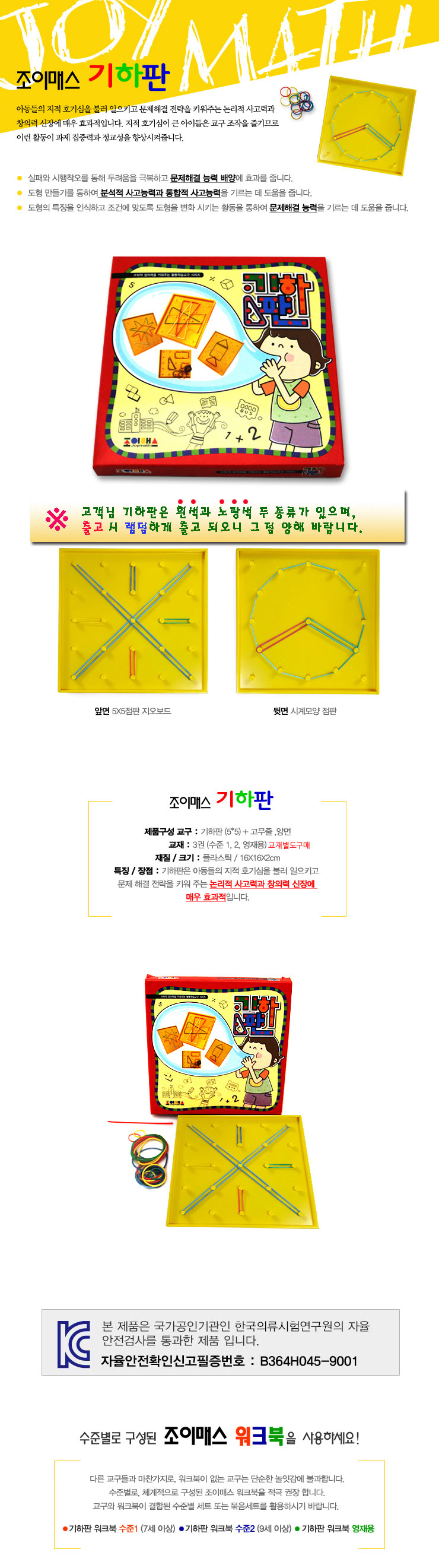 조이매스 기하판은 아동들의 지적 호기심을 불러 일으키고 문제해결 전략을 키워주는 논리적 사고력과 창의력 신장에 매우 효과적이다.