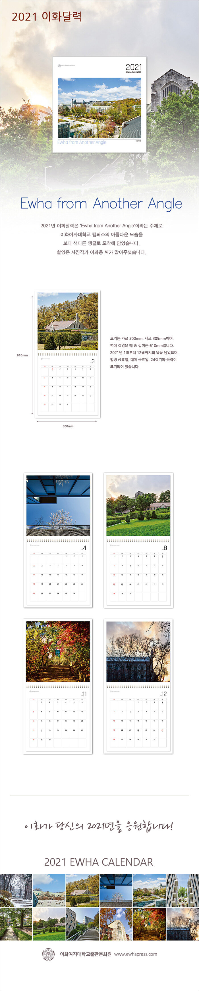 ‘Ewha from Another Angle’이라는 주제로 이화여자대학교 캠퍼스의 아름다운 모습을 보다 색다른 앵글로 포착해 담았다. 촬영은 사진작가 이과용 씨가 맡았다.