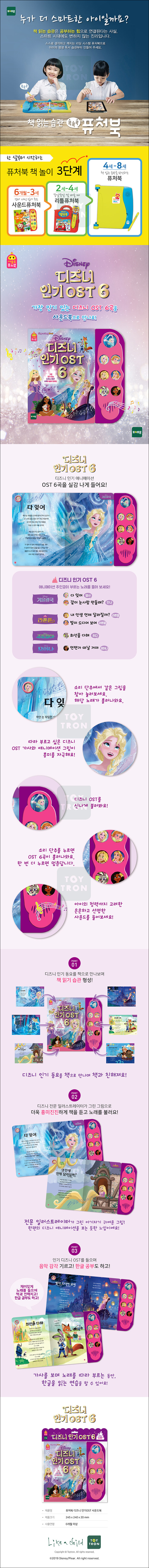 '겨울왕국' 2곡, '라푼젤' 2곡, '주토피아', '모아나' 디즈니 인기 OST 6곡으로 구성되어 있다. 퓨처북 디즈니 OST 라이브러리에 수록된 음향과 같은 콘텐츠로 64MB의 고용량 고품질의 음향을 사용해 아이들의 청각을 자극하며 교육 효과를 높여 준다.