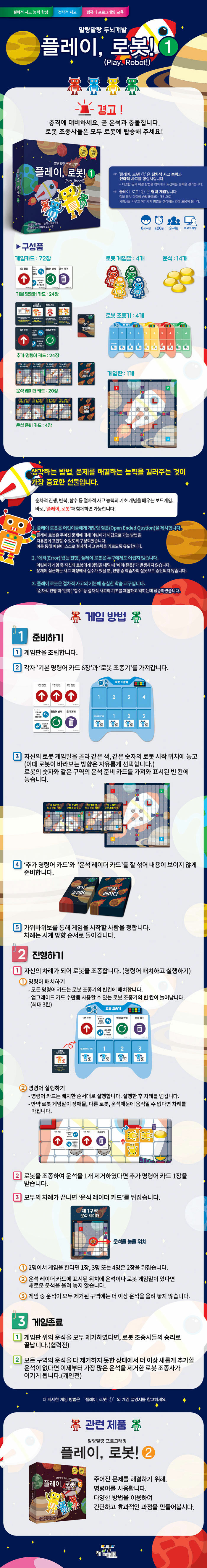 초급용 제품으로 사용자가 직접 로봇 조종사가 되어 우주선으로 날라오는 운석을 제거하는 것이 목표로 설정되었으며, 다양한 명령어 카드를 조합하여 임무를 완수하도록 개발되어 절차적 사고와 문제해결 능력을 향상시킬 수 있다.