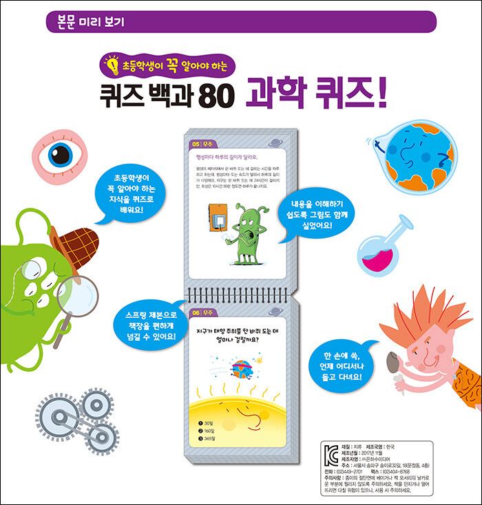· 제목 : 초등학생이 꼭 알아야 하는 퀴즈 백과 80 : 과학 퀴즈! (스프링) (두뇌 똑똑! 지식 쑥쑥! 두뇌 발달 퀴즈)