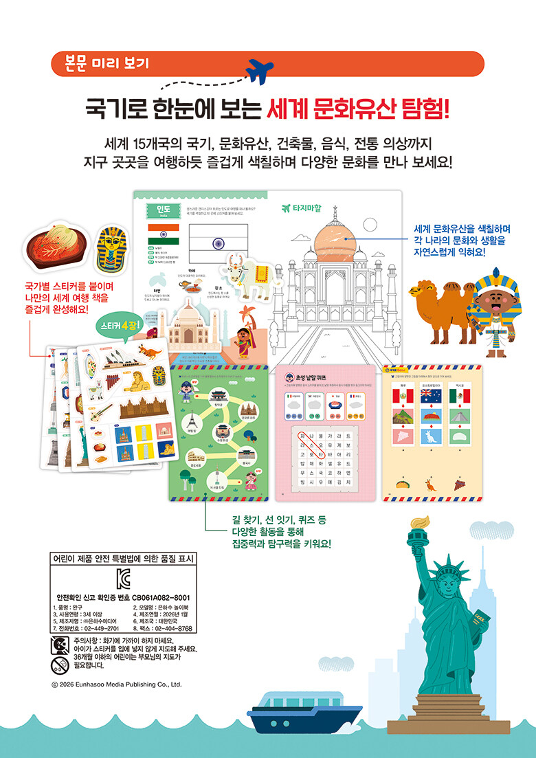 나라별 문화유산·음식·전통 사물 스티커를 붙이며 창의력과 성취감을 높입니다. 페이지별로 정리된 스티커를 바로 확인할 수 있어 혼자서도 쉽게 활동을 이어 갈 수 있어요.