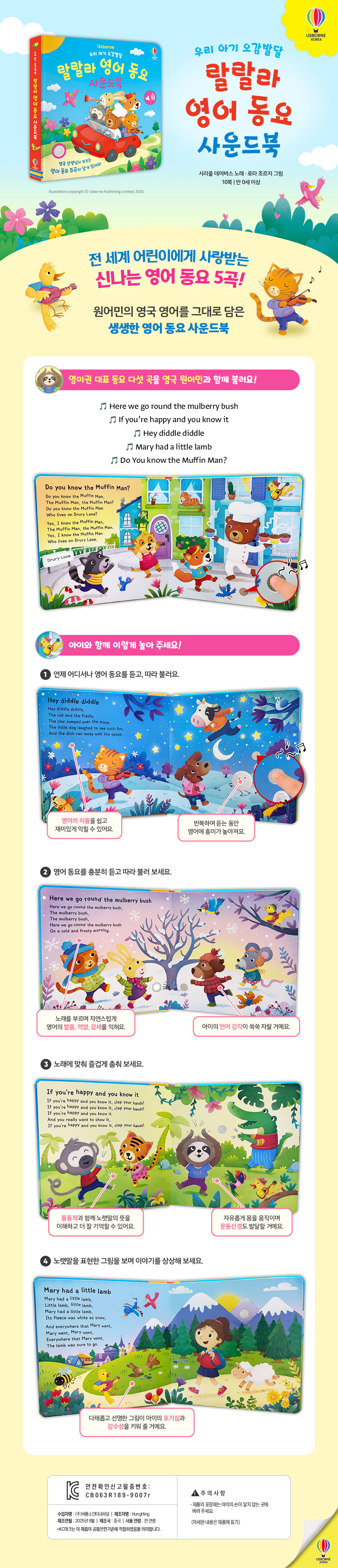 전 세계 어린이에게 사랑받는 영어 동요 5곡을 담은 사운드북으로, 영국 원어민의 발음과 억양을 그대로 들을 수 있다. 버튼을 누르면 악기 소리와 함께 노래가 흘러나오고 반복 리듬 속에서 자연스럽게 영어 발음과 감각을 익히는 놀이형 학습을 돕는다.