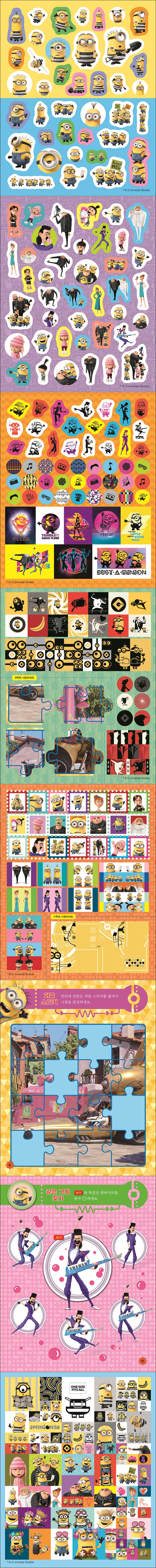 엉뚱발랄 유쾌한 에너지가 가득한 미니언즈를 스티커북으로 구성했다. 슈퍼배드 특유의 웃음을 유발하는 캐릭터들이 총 출동해 영화의 감동을 생생하게 느낄 수 있다. 스티커 놀이를 하며 같은 그림 찾기, 퍼즐 완성하기 등 재미있는 게임도 함께 할 수 있다.