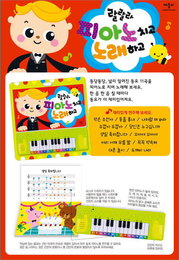 동요 악보와 멋진 피아노가 함께 들어 있는 악기놀이 책이다. 우리 동요 11곡을 수록했다. 아이 손에 꼭 맞는 아담한 사이즈의 피아노는 언제 어디서든 쉽게 연주할 수 있으며, on/off 스위치가 있어서 사용하지 않을 때는 꺼둘 수 있다.