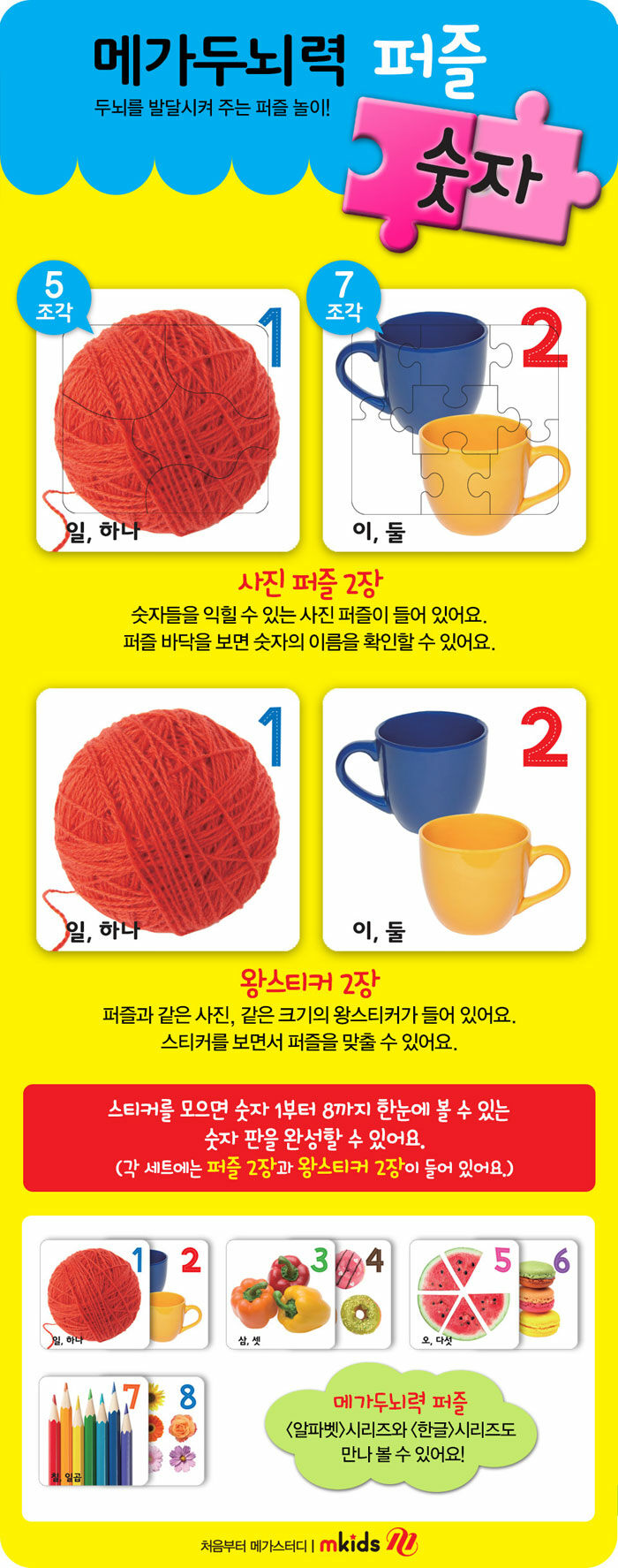 두뇌를 발달시켜 주는 퍼즐 놀이다. 재미있는 퍼즐을 보며 집중력을 키우고, 퍼즐 조각을 맞추며 소근육을 키운다.