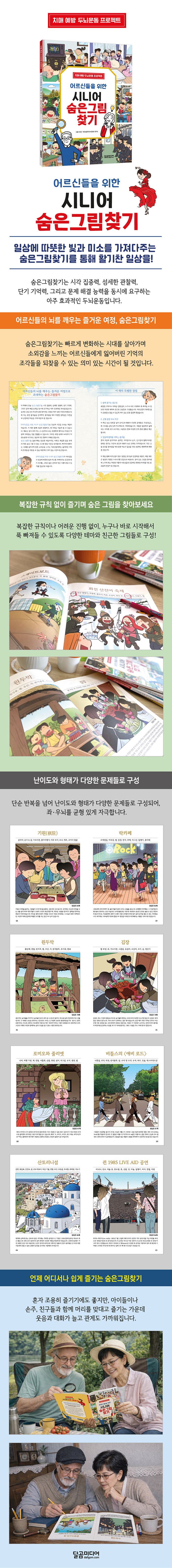 숨은그림찾기를 통해 시각 집중력과 관찰력을 자연스럽게 자극한다. 어르신도 쉽게 시작할 수 있는 구성으로 일상 속 두뇌 활동과 안정적인 시간을 함께 제안하는 책이다.