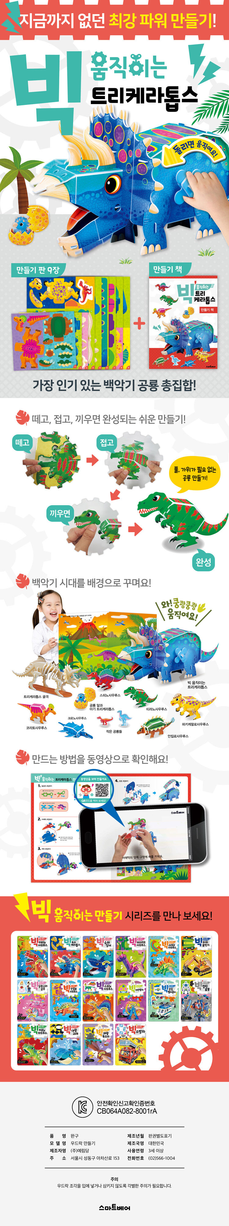 쿵쾅쿵쾅! 내가 만든 트리케라톱스가 움직인다면 어떨까? <빅 움직이는 트리케라톱스>는 우드락 소재의 만들기 판에서 조각을 톡톡 떼어 내 쏙쏙 끼워 만드는 입체 모형 만들기 책이다. 축이 돌아가는 원리를 이용해 공룡을 움직이도록 설계하여 아이들에게 과학적 사고는 물론 창의력과 입체적인 사고력을 키우는 데 도움을 준다.