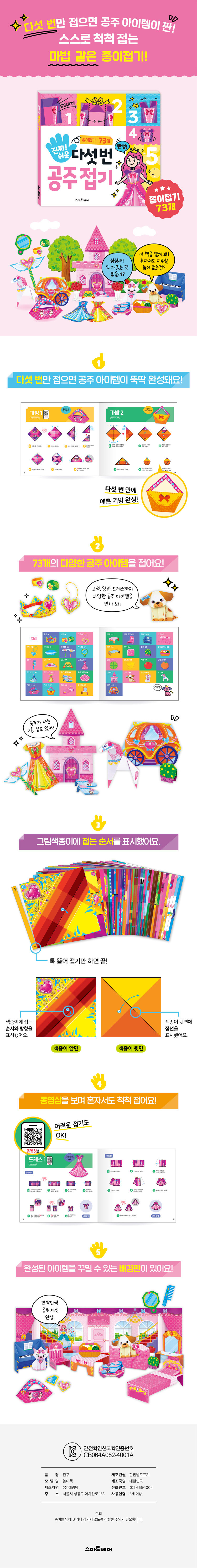 다섯 번만 접으면 공주 아이템이 완성되는 종이접기 책이다. 색종이 한 장으로 손가락을 쓰는 섬세한 과정을 통해 소근육과 두뇌를 자극하고, 순서대로 접으며 집중력과 창의력을 기르게 한다. 비싼 재료 없이 언제 어디서나 혼자 즐길 수 있는 놀이 활동이다.
