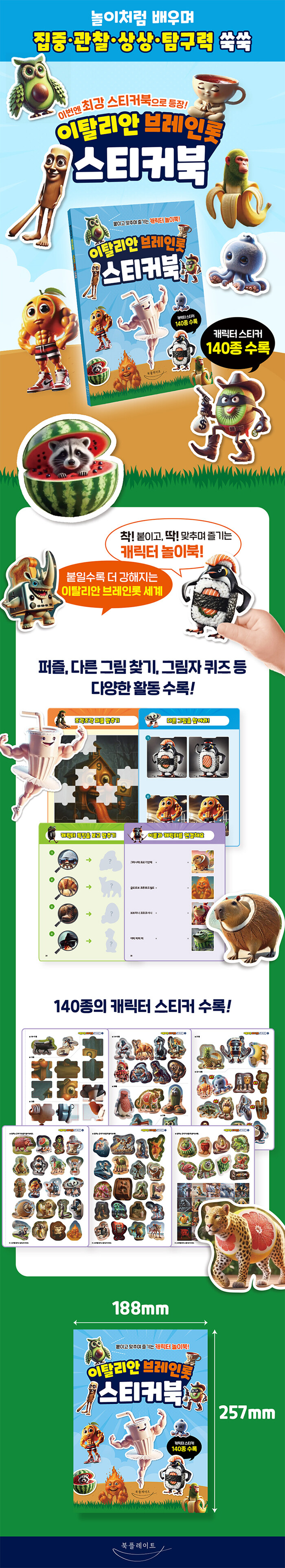 AI 합성과 이탈리아어식 이름으로 탄생한 이탈리안 브레인롯 캐릭터 140종 스티커 활동북. 총 140종의 이탈리안 브레인롯 캐릭터 스티커가 수록되어 있으며, 일부는 활동에 활용하고 나머지는 소장하거나 자유롭게 꾸밀 수 있는 스티커로 구성되어 있다.