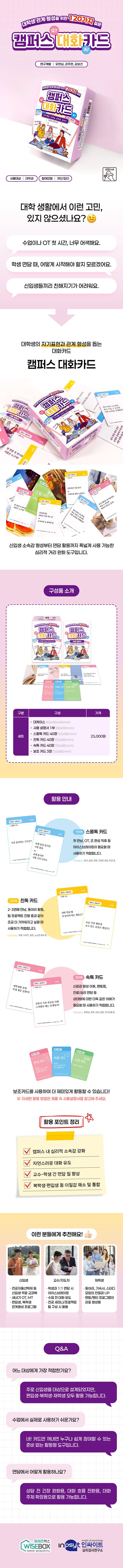 <캠퍼스 대화카드>는 수업, 면담, 동아리 활동 등에서 친밀한 상호작용을 유도할 수 있는 카드다. 특히, 대학 신입생들의 대인관계 소통을 돕고 캠퍼스 생활의 적응을 돕는 데 유용하다.