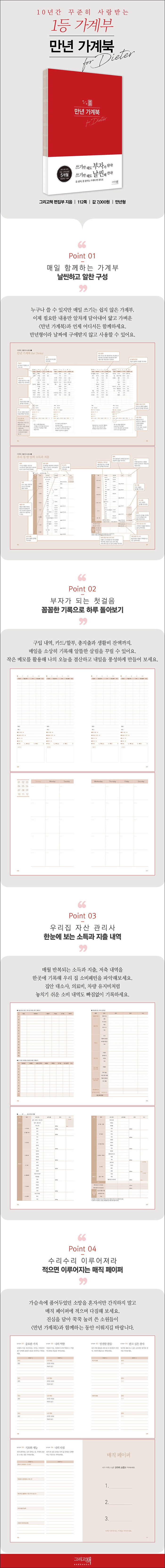 다이어트, 시험, 자격증 등 다양한 방면에 꼭 어울리는 <만년 가계북>. 세계적인 부자 록펠러 가문에서 자손들에게 가장 먼저 가르치는 경제 습관은 ‘가계부 기록 하기’다. 존.D.록펠러가 지금의 부를 이룰 수 있었던 건 18살 때부터 가계부를 꾸준히 작성한 덕분이다.