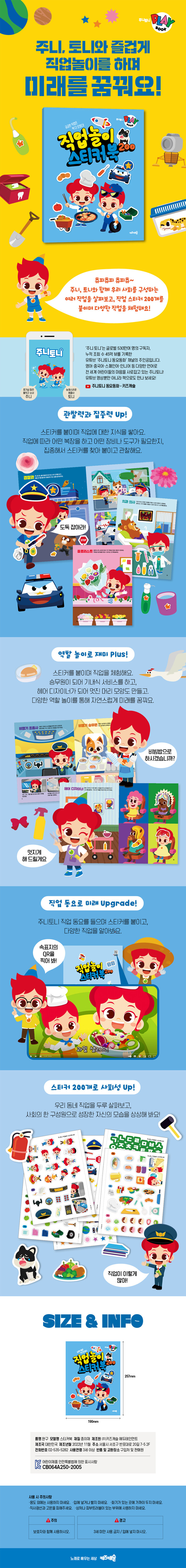 우리 아이가 좋아하고 궁금해하는 직업은 싹 다 모았다! 전 세계 500만 키즈 구독자가 사랑하는 유튜브 캐릭터 주니토니와 함께 200개의 스티커를 붙이며 다양한 직업에 대해 알아보자. QR코드를 찍어 다양한 주니토니 직업 동요를 들으며, 우리 사회를 구성하는 여러 직업을 살펴보자.
