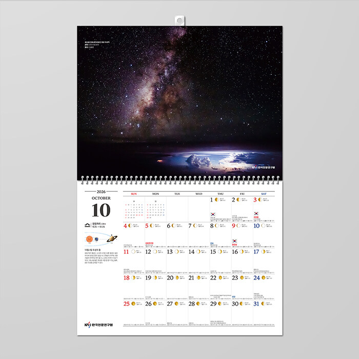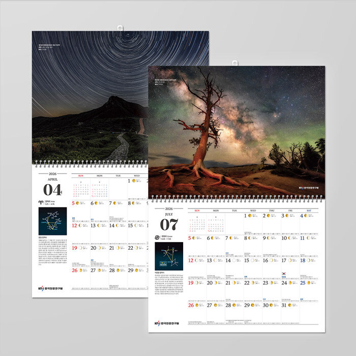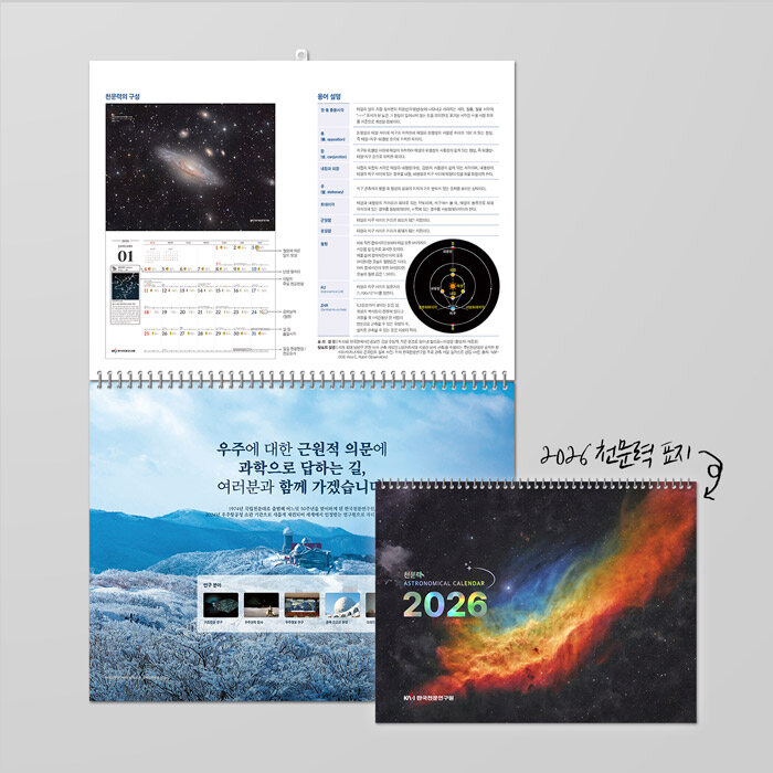 연간천문종합지 ‘2026년도 천문력(벽걸이용)’은 한국천문연구원에서 매년 발행하는 우리나라에 최적화된 믿을 수 있는 벽걸이용 천문캘린더이다. 고퀄리티의 인쇄과정을 거친 13장의 천문 이미지들은 2026년 이후에도 소장가치가 높다.