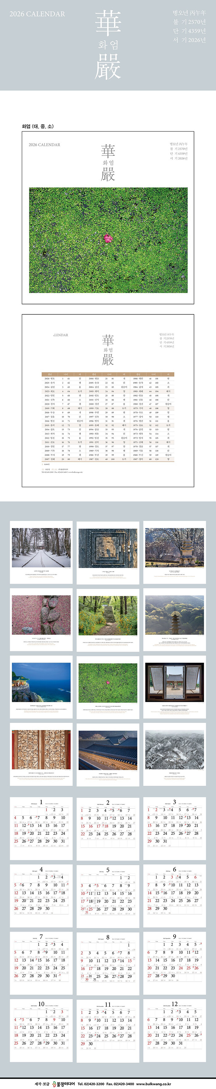2026년 달력 [화엄(華嚴)]은 오랜 시간과 고요함이 깃든 열두 곳의 아름다운 화엄 사찰과 사지(寺址)에서 마주한, 마음속 깊이 스며들 평화로운 순간들을 오롯이 담았다.