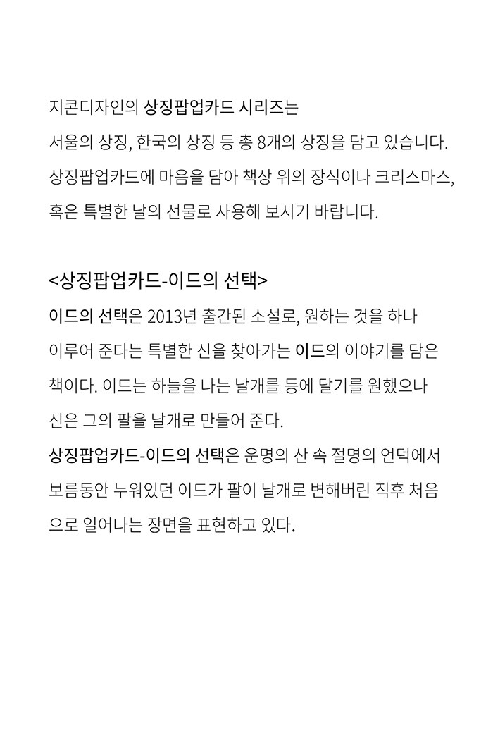 이드의 선택은 2013년 출간된 소설로, 원하는 것을 하나 이루어 준다는 특별한 신을 찾아가는 이드의 이야기를 담은 책이다. 이드는 하늘을 나는 날개를 등에 달기를 원했으나 신은 그의 팔을 날개로 만들어 준다. 상징팝업카드-이드의 선택은 운명의 산 속 절명의 언덕에서 보름동안 누워있던 이드가 팔이 날개로 변해버린 직후 처음으로 일어나는 장면을 표현하고 있다.