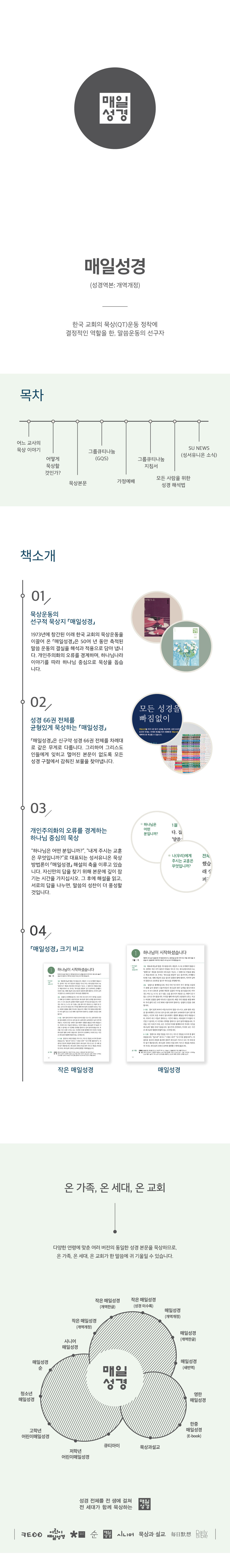 1973년부터 발행된 매일성경은 성경 본문에 집중하도록 구성한 큐티 노트로 신구약 66권을 균형 있게 다루며 해설과 적용을 충실히 담았다 전 연령과 다양한 언어로 제공되어 온 가족이 함께 말씀을 읽고 나눌 수 있도록 돕는다.