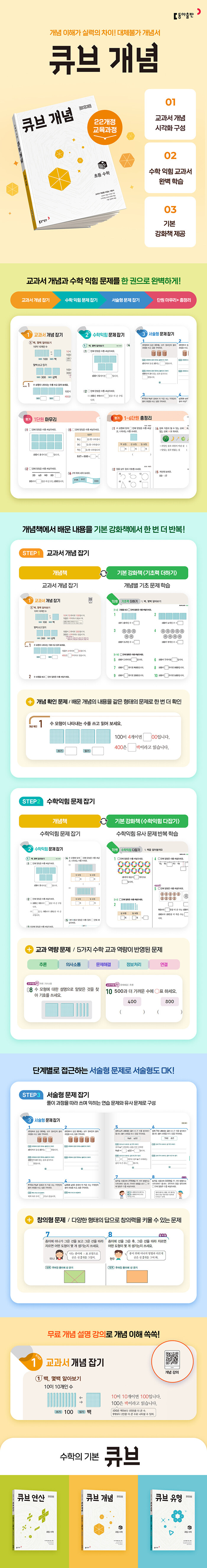 <큐브 개념>은 교과서 개념을 다잡을 수 있는 기본서이다. 특히, 교과서 개념을 시각화하여 쉽게 이해할 수 있도록 구성하였고, 수학 익힘 교과서 문제 유형을 완벽하게 학습할 수 있다. 서술형 문제는 풀이 과정을 따라 쓰며 익히는 연습 문제와 유사 문제로 구성되어 있다.