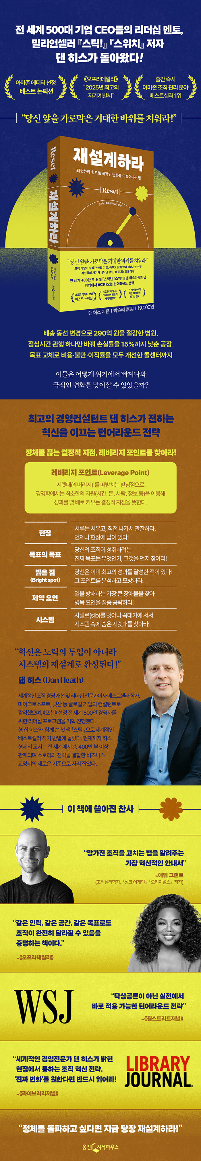 왜 우리는 같은 문제를 반복하며 제자리를 맴도는가? 세계적인 조직 경영 개선 및 리더십 전문가이자 『스틱!』, 『스위치』 등 전 세계 누적 400만 부 이상의 판매고를 올린 베스트셀러 작가 댄 히스의 신간 『재설계하라』가 출간되었다. 전작『업스트림』이 문제의 근원을 찾아 사전에 차단하는 법을 다루었다면, 『재설계하라』에서는 이미 굳어버린 시스템, 즉 ‘안 되는 일’을 단숨에 ‘되는 일’로 바꾸는 강력한 전환 전략인 ‘재설계(Reset)’를 제시한다.