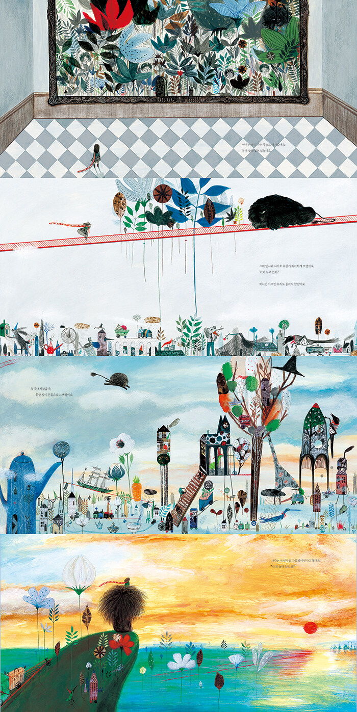 벽에 걸린 액자의 거리를 보폭 삼아 고요히 그림을 감상하는 엄마 아빠 사이에서, 아이는 신비한 소리에 이끌려 커다란 그림 앞에 선다. 마치 아이를 초대하기라도 한 듯 그림 속에서 문이 스르르 열리고, 아이는 길이 이끄는 대로 성큼성큼 나아가는데…….