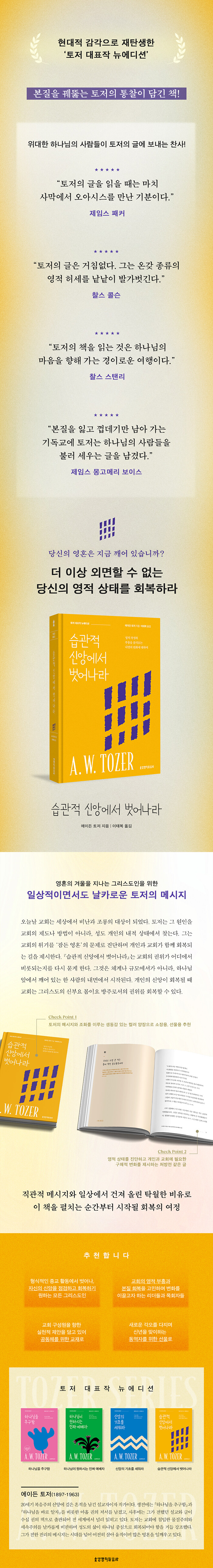 『습관적 신앙에서 벗어나라』는 ‘20세기 위대한 설교자’로 평가받는 에이든 토저의 설교 메시지를 개혁과 부흥이라는 주제 아래서 하나로 엮은 책이다. 1950년대 캐나다 토론토에서 선포된 토저의 메시지는 80여 년이 지난 지금도 여전히 빛을 발한다. 그는 타성에 젖은 성도들을 깨우기 위해 설교 중 일상적이면서도 날카로운 비유를 즐겨 사용했다. 여기서는 형식적인 신앙을 ‘잠든 상태’, ‘영혼의 겨울’, ‘나무로 된 의족’ 등에 빗대어 표현한다.