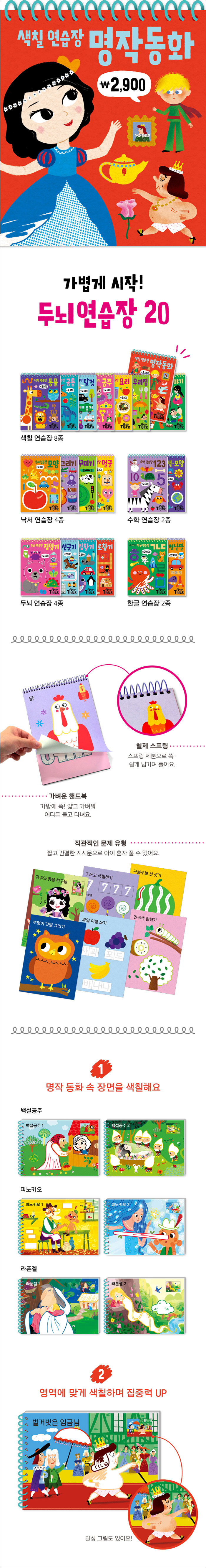 두뇌 연습장 시리즈. 색칠은 물론 긋고 그리는 활동부터 한글, 수학까지 첫 두뇌 발달을 위한 20가지 주제의 다양한 활동으로 구성되었다. 가벼운 스프링 연습장 형태로 어디든 가지고 다니기 좋으며, 한 눈에 이해되는 구성으로 워크북이 처음인 아이도 부담이 없다.