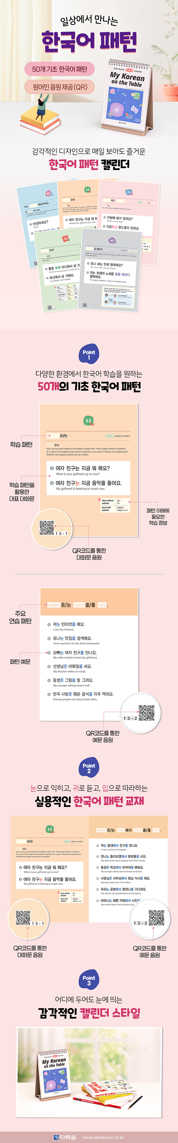 한국어를 열심히 ‘학습’하는 게 아니라 자연스럽게 한국어에 스며들고 싶어 하는 다양한 환경의 학습자들을 위해 기획된 책으로, 기초 한국어 패턴 50개를 하루 한 개씩 눈으로 익히고, 귀로 들으며, 입으로 따라 할 수 있도록 만들었다.