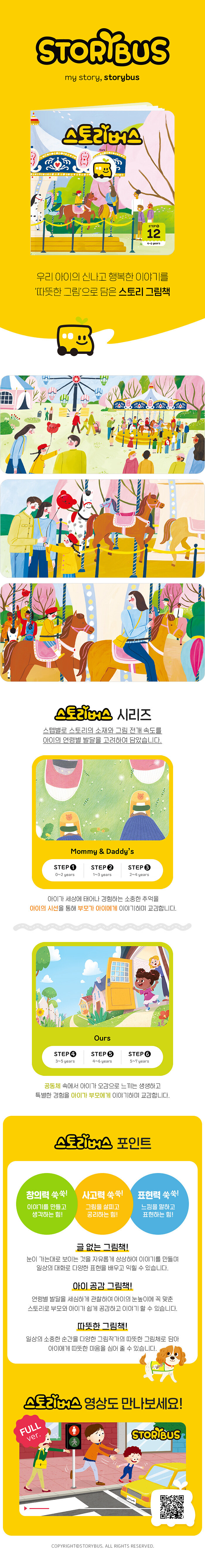 벚꽃이 흩날리는 어느 봄날, 엄마, 아빠와 함께 놀이공원에 놀러 간 아이가 빙글빙글 돌아가는 회전목마를 타는 즐거운 순간을 담은 그림책이다. 아이와 함께 스토리버스를 펼쳐 놓고 가족과 함께한 행복하고 즐거웠던 순간을 떠올려 이야기 나누어 보자. 우리 아이의 가슴 속에 가족과의 사랑이 가득 채워져 마음이 따뜻한 어른으로 자랄 수 있는 씨앗이 되어 줄 것이다.