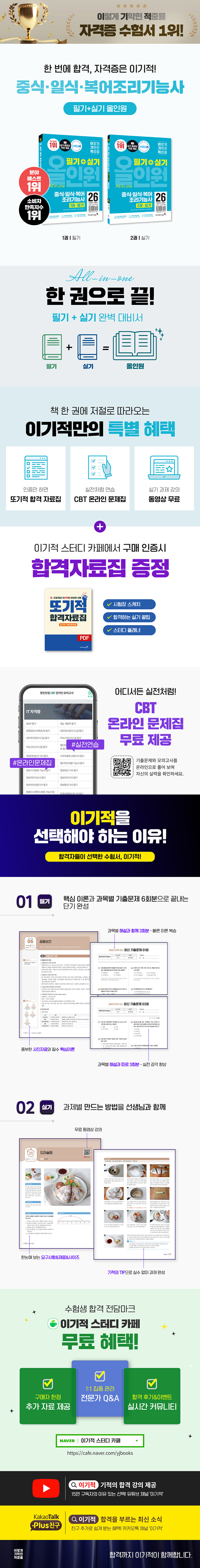 실기 특성상 텍스트로만 이해하기 어려운 조리 과정을 한눈에 볼 수 있도록 구성하였고, 기적의 TIP 등 자세한 설명을 덧붙여 독자의 이해도를 높였습니다.
