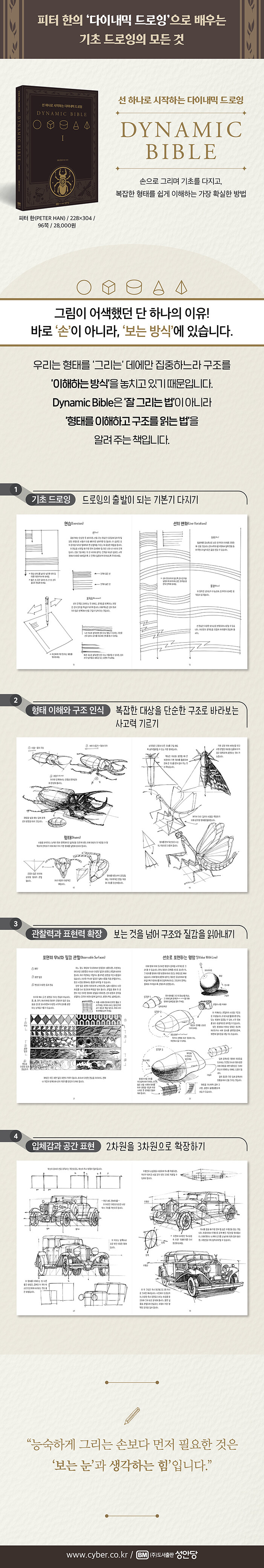 드로잉을 공부하는 많은 이들이 공통으로 겪는 어려움은 ‘어떻게 시작해야 하는가?’, 그리고 ‘어떻게 올바르게 볼 것인가?’이다. 특히 디지털 도구의 보편화로 누구나 쉽게 그림을 그릴 수 있게 되었지만, 정작 기초인 형태·구조·관찰의 원리를 제대로 익히지 못해 성장의 한계에 부딪히는 경우가 많다. 『Dynamic Bible』은 이러한 문제를 가장 명확하게 해결해 주는 드로잉 기초서다. 이 책은 선을 긋는 첫 과정부터 형태를 단순화하고 구조를 파악하는 시각적 사고까지, 드로잉의 기본기를 단계적으로 구축하도록 설계되어 있다. 단순히 예시를 따라 그리는 방식이 아니라, ‘왜 이렇게 그려야 하는가?’를 이해하고 반복을 통해 자신의 시각 언어를 만들어 가는 방식을 제시한다. 특히 이 책의 강점은 기초를 새롭게 세우려는 초보자부터 이미 실무에서 활동 중인 아티스트까지 모두에게 유효하다는 점이다. 명확한 설명과 구조적 예제는 처음 배우는 이들에게 안정적인 기반을 제공하고, 숙련된 작가에게는 기본기의 빈틈을 다시 점검하며 더 높은 단계로 나아갈 수 있는 길을 열어준다. 빠르게 변화하는 디지털 드로잉 환경 속에서, 도구보다 먼저 배워야 할 것은 ‘보는 힘’과 ‘구조를 이해하는 능력’이다. 『Dynamic Bible』은 그 출발점이 되어 독자가 스스로 사고하고 그릴 수 있는 힘을 길러준다. 이 책은 단순한 실기서가 아니라, 창작 과정 전반에 적용할 수 있는 기초드로잉의 확실한 기준이다.