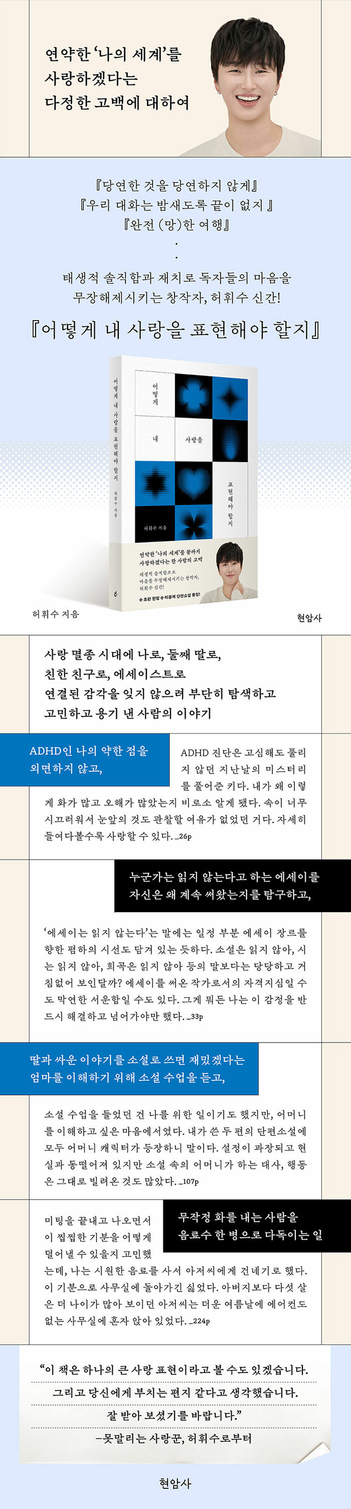 유튜브 채널 〈김은하와 허휘수〉로 구독자 23.6만 명의 열렬한 응원을 받으며 활발히 활동 중인 창작자 허휘수, 그가 신작 『어떻게 내 사랑을 표현해야 할지』로 돌아왔다.