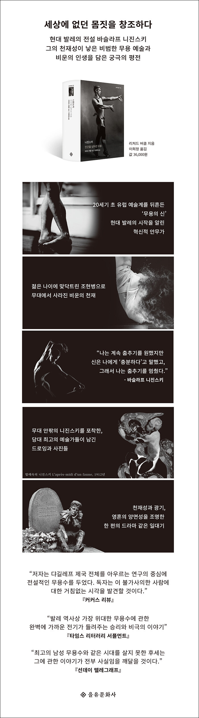 ‘현대 예술의 거장’ 시리즈는 20세기를 전후한 문화 예술계에 큰 영향력을 끼친 국내외 거장 아티스트의 평전으로 구성된다. 2018년부터 다시 출간되는 본 시리즈의 열두 번째 주인공은 러시아의 전설적인 무용수 바슬라프 니진스키다.