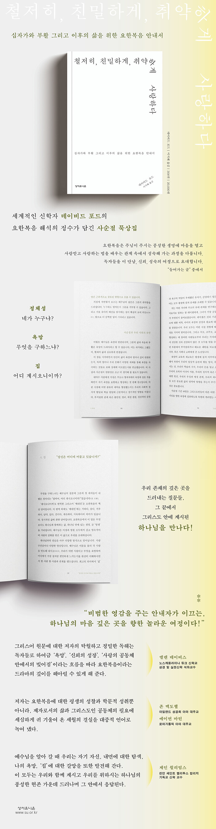 세계적인 신학자 데이비드 포드가 20년간 요한복음을 묵상하며 얻은 결실의 정수가 담긴 사순절 묵상집이다. 고도의 문학성과 신학적 깊이를 지닌 요한복음은 매우 정교하게 빚어진 작품이다. 저자는 이 유려한 본문의 의미를 발견하는 데 도움을 주는 세 가지 관점을 정체성, 욕망, 집에 대한 질문으로 제시한다.