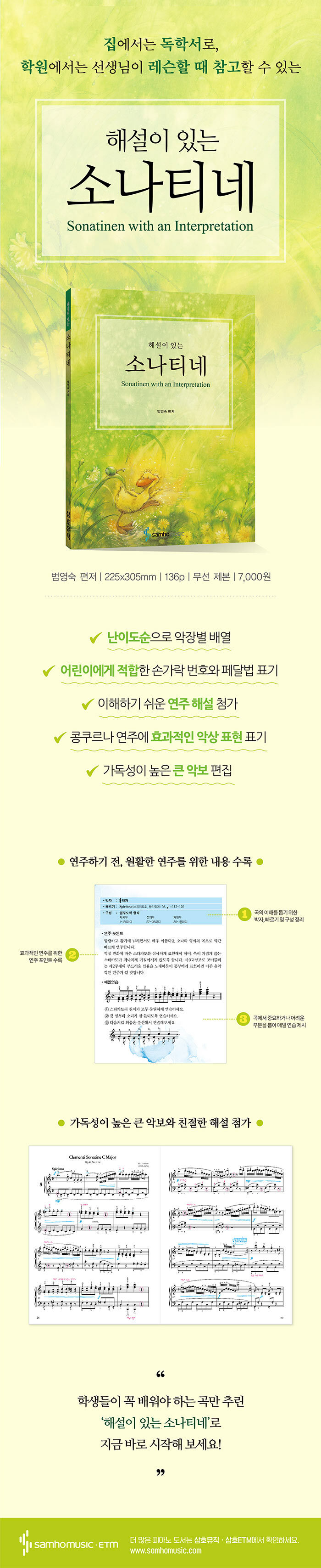 어린이들이 꼭 공부해야 하는 소나티네만을 간추려 비교적 익히기 쉬운 악장부터 어려운 악장까지 난이도순으로 배열한 곡집이다. 어린이들의 작은 손에 맞는 손가락 번호와 간단하고 효과적인 페달법을 표기되어 좀 더 쉽고 무리 없이 연주할 수 있다.