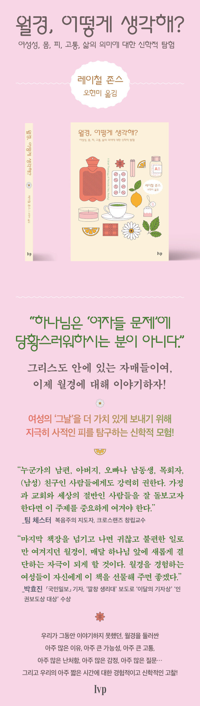 하나님의 말씀과 관련해 믿을 수 없을 만큼 놀라운 것은, 이 말씀이 정말로 삶의 모든 면을 향한다는 것이다. 그리고 소셜 미디어, 일, 여가, 성, 아름다움, 우정 등에 관해 성경이 뭐라고 말하는지를 알려 주는 책은 많고도 많다. 그런데 월경에 관해 말하는 책은? 그리 많지 않다. 하지만 그리스도인들이 이 문제에 관해 지나치게 점잔을 뺀다면 이는 성경이 그렇게 하기 때문이 아니다. 성경은 불쾌한 현실을 있는 그대로, 사실적으로 보여 준다. 성경은 난처한 실제 삶에 대해서 말한다. 고통과 인내에 대해, 부끄러움과 몸부림에 대해, 실망스러운 일과 상실과 사랑에 대해 말한다. 성경은 피에 대해서도 많은 말을 한다.