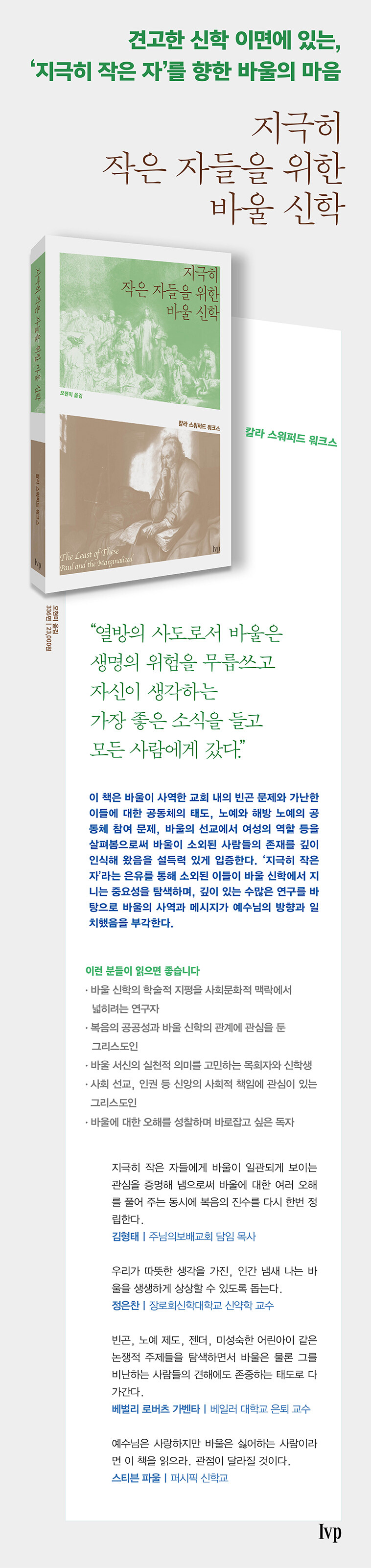 지극히 작은 자에 대한 바울의 관심은 타인을 향한 인식에 그치지 않는다. 그는 자신도 “사도 중에 가장 작은 자”로 인식했다. 사도라 불릴 자격이 없는 자를 그리스도께서 불러 주셨다는 이 자기 인식은 가난한 자, 노예, 여성, 이방인들처럼 소외된 이들을 향한 복음 전파의 사명에도 큰 영향을 끼쳤다. 로마가 지배하던 1세기 사회에서 바울은 모든 사람에게 기꺼이 노예가 되려 했고, 교회 공동체를 향해서도 서로의 종이 되라고 말했다. 바울은 당대에 부조리한 현실에 대해 체제 전복적인 주장을 소리 높여 제기하지는 않았지만, “지극히 작은 자”로서 자신의 정체성을 분명히 인식했다. 저자는 이런 생각에 바탕을 둔 그의 사역이 가난한 자들을 위한 그리스도의 사역과 이어져 있음을 명확히 보여 준다.