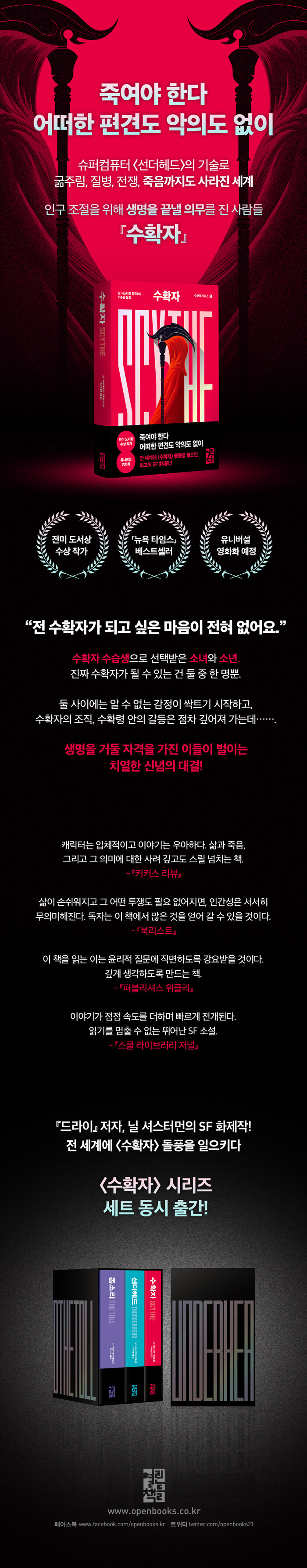 슈퍼컴퓨터가 통제하는 죽음이 사라진 완벽한 미래, 컴퓨터의 통제를 받지 않는 건 인구 조절을 위해 생명을 끝낼 임무를 맡은 <수확자>들뿐. 의미 있는 죽음이란 무엇인가? 수확자들은 저마다의 신념을 갖고 살아 있는 사신(死神)이 되어 죽음의 낫을 휘두른다.