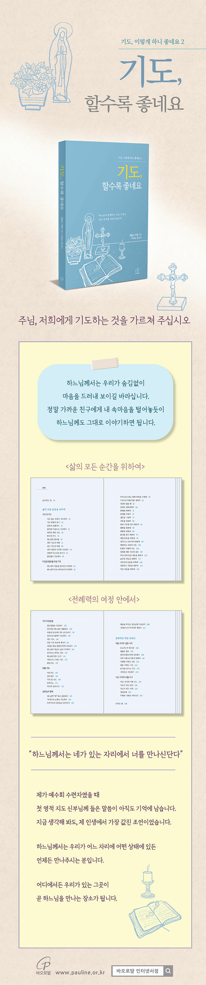 기도에 대한 몇 가지 기초와 더불어 삶의 모든 순간에 ‘다양한 필요와 지향’으로 바치는 기도들과 ‘여러 기도 방법’에 대해 안내하며, 전례력에 따른 기도 생활 또한 영성적으로 이끌어 준다. 특히 생각과 마음을 넓혀 세상과 이웃의 여러 상황을 품고 기도할 수 있도록 부드럽게 독려한다.