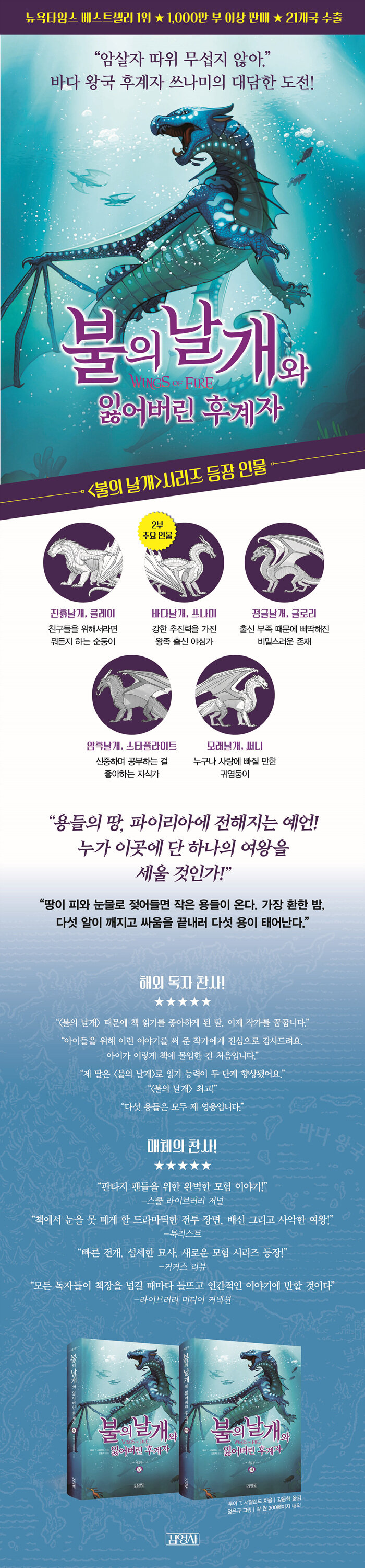 전 세계 21개국 출간, <뉴욕타임즈> 베스트셀러 1위, 1,000만 부 이상 판매된 블록버스터급 판타지 동화. 평화의 발톱 계획으로 동굴 안에 갇혀 전사로 키워진 다섯 용들이 세상으로 나가 가족와 원래 신분을 찾고 점차 자신의 본모습과 운명을 개척하는 이야기가 펼쳐진다.