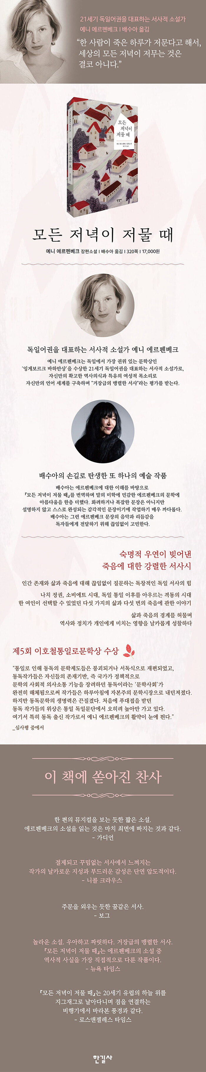예니 에르펜베크는 독일에서 가장 권위 있는 문학상인 '잉게보르크 바하만상'(2001)을 수상한 21세기 독일어권의 대표적인 서사적 소설가다. 에르펜베크는 <모든 저녁이 저물 때>에서 사회와 국가가 개인의 운명을 어떻게 바꾸어놓을 수 있는지 깊이 파고들며 독창적인 독일 서사의 힘을 보여준다.