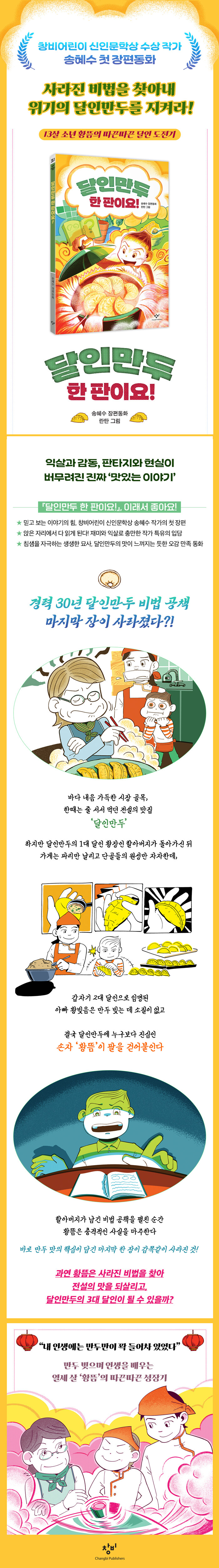 만두 장인을 꿈꾸는 열세 살 황뜸이 사라진 비법을 찾아 나서는 성장담이다. 창비어린이 신인문학상 수상 작가 송혜수의 첫 장편동화로 『나의 낯선 가족』 이후 선보인 작품이다. 가족의 갈등과 시장의 위기 속에서 달인만두를 지키려는 여정이 유쾌하면서도 뭉클하게 펼쳐진다.