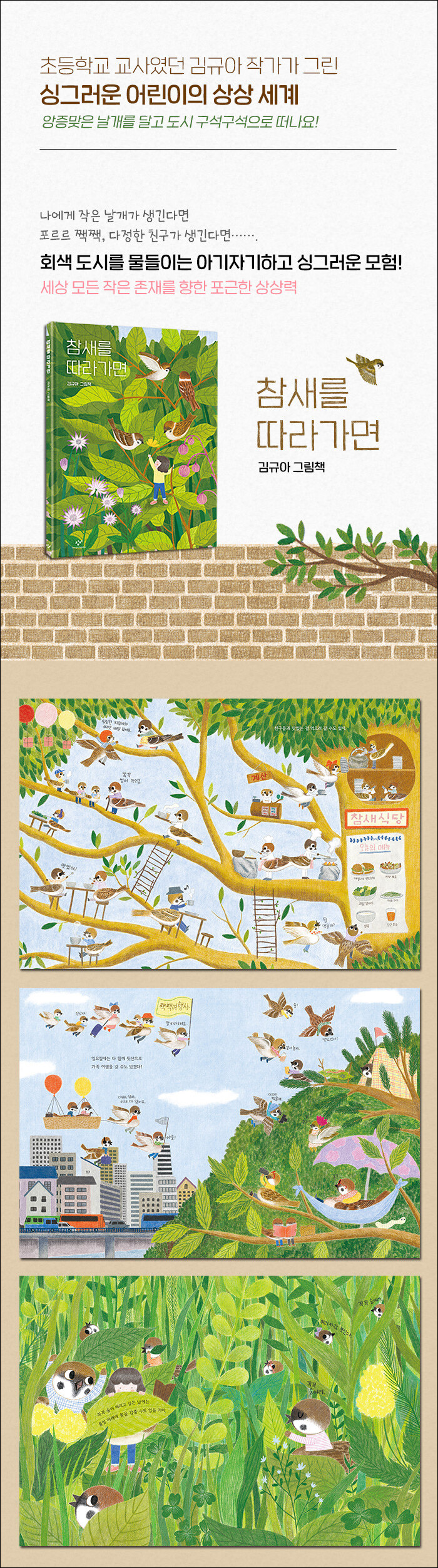김규아 작가의 첫 창작 그림책 <참새를 따라가면>. 고층 빌딩으로 둘러싸인 도시에서 외로운 마음을 달래는 아이와, 이를 누구보다도 잘 알아주는 참새들의 우정 이야기를 그렸다.
