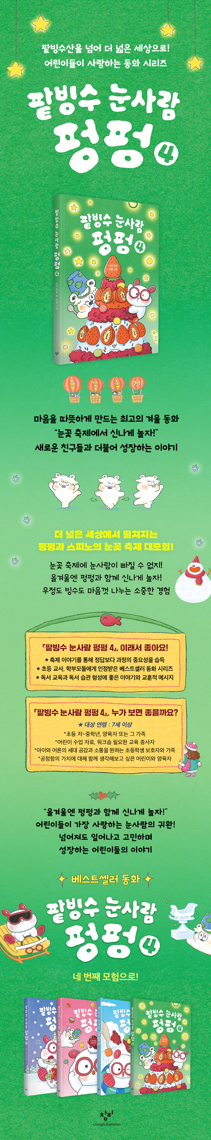 마법 안경을 만들어 주는 펑펑과 그의 든든한 친구 북극곰 스피노의 이야기 『팥빙수 눈사람 펑펑』이 네 번째 이야기로 돌아왔다. 이번 4권에서 펑펑과 스피노는 팥빙수산 꼭대기를 벗어나 그토록 기다리던 ‘눈꽃 축제’에 간다.