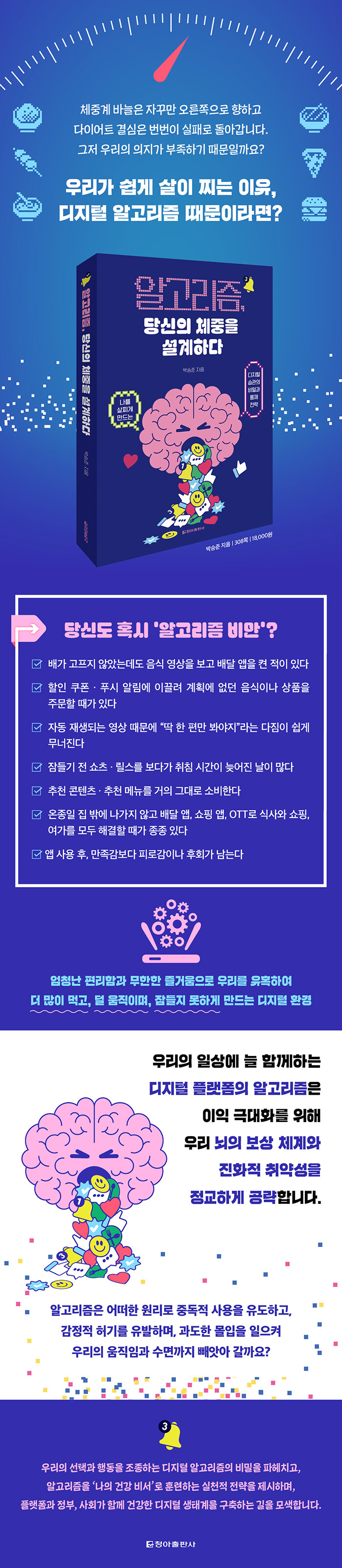 오늘날 우리는 그 어느 때보다 건강에 관심이 많고, 건강 관련 정보도 넘쳐나지만, 왜 건강과 점점 더 멀어지고 있을까? 꾸준히 증가하는 비만율은 좀처럼 내려올 줄 모르고, 다이어트 결심은 번번이 실패로 돌아간다. 이 책은 그 모순의 배경에 건강하지 못한 행동을 유도하는 디지털 플랫폼의 ‘알고리즘’이 자리하고 있음을 짚어 낸다.