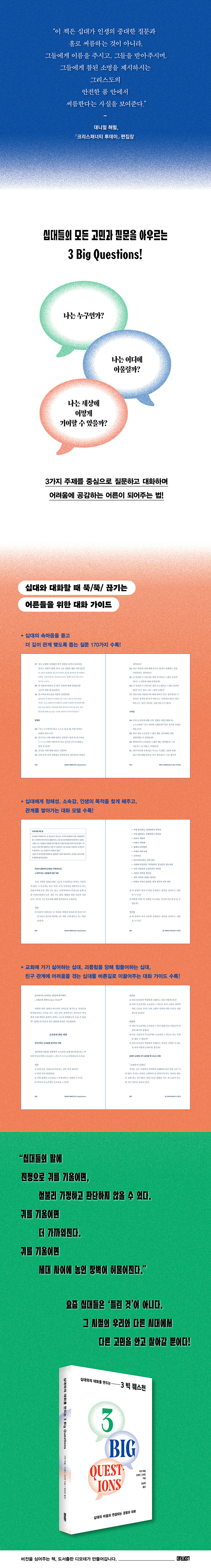 세 가지 큰 질문은 ‘청소년들만’ 던지는 것이 아니다. 이것은 모든 ‘인간’이 던지는 질문이다. 이 질문은 사춘기 아이들에게만 의미 있는 것이 아니라, 저자인 우리 두 사람에게도 의미 있다. 물론 당신에게도 깊은 의미가 있다. 하지만 특히 청소년의 마음속에서는 정체성, 소속감, 목적에 대한 세 가지 큰 질문이 끊임없이 맴돌고 있다.