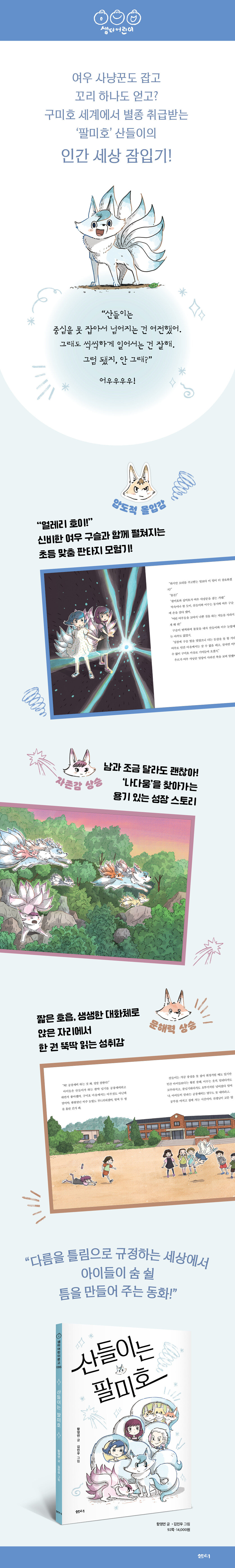 샘터어린이문고 86권. 모두가 구미호인 세상에서 홀로 꼬리가 여덟 개뿐인 팔미호 산들이의 꼬리 찾기 대장정! 사라진 아기 여우들을 구하기 위해 인간 세상으로 떠난 산들이는 그곳에서 꼬리가 열 개라 고민인 십미호 이수를 만난다. 정반대의 고민을 가진 두 친구의 모험을 통해, 남들과 다른 특성을 긍정하고 서로의 다름이 힘을 합칠 때 더 큰 용기가 만들어진다는 당당하고 희망찬 메시지를 전한다.