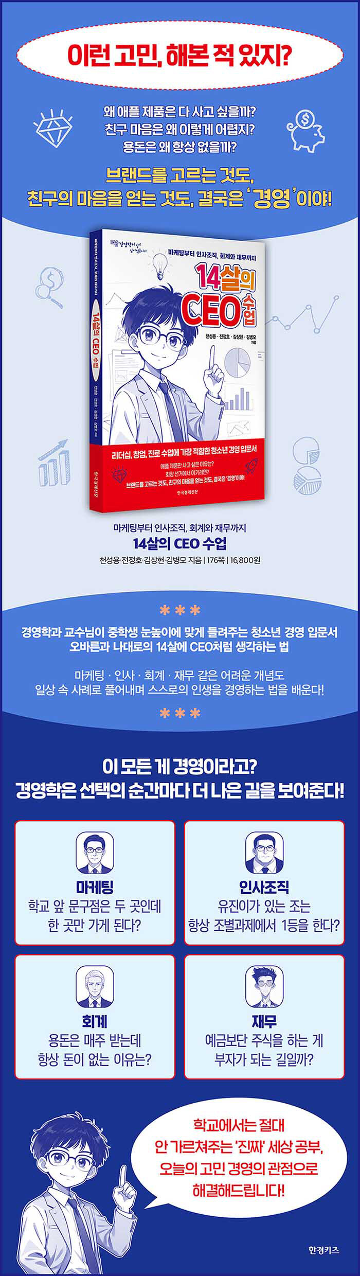 많은 사람들이 경영학을 회사 사장님이나 대기업 직원들만 필요로 하는 어려운 학문이라고 생각합니다. 하지만 사실 경영학은 우리가 살아가는 거의 모든 순간과 이어져 있습니다. 친구들과 뭘 하고 놀지 결정할 때도, 학급 회장 선거에 나갈 때도, 앞으로 직업을 고를 때도 결국은 ‘선택’과 ‘경쟁’ 속에서 다른 사람의 마음을 얻어야 하죠. 이 과정에서 가능한 한 적은 자원으로 가장 큰 효과를 내는 ‘효율성’까지 고민해야 합니다. 이렇게 사람의 마음을 얻는 과정, 그리고 한정된 시간과 에너지를 가장 알맞게 쓰는 방법, 이것이 바로 경영학이 다루는 핵심 문제입니다.