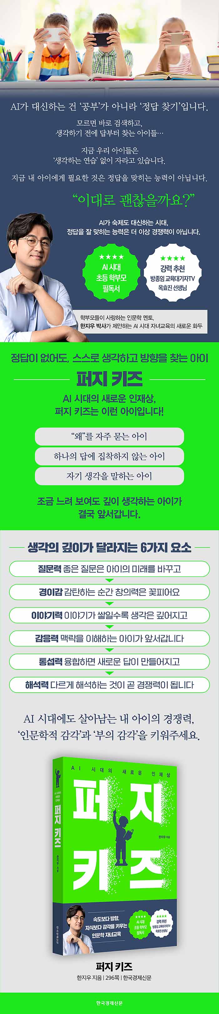 《퍼지 키즈》는 단순한 교육법을 알려주는 책이 아니다. 오히려 부모에게 더 근본적인 질문을 던진다. 우리는 아이를 정답을 잘 맞히는 사람으로 키우고 있는가, 아니면 스스로 생각하고 선택하는 사람으로 키우고 있는가? AI가 답을 대신하는 시대일수록, 아이에게 필요한 것은 더 많은 정답이 아니라 더 깊은 질문이다. 아이의 미래를 결정하는 것은 지식의 양이 아니라, 세상을 해석하는 방식이다. 그리고 그 출발점은 아이를 ‘더 똑똑하게’ 만드는 것이 아니라 ‘더 퍼지하게’ 자라도록 돕는 데 있다.